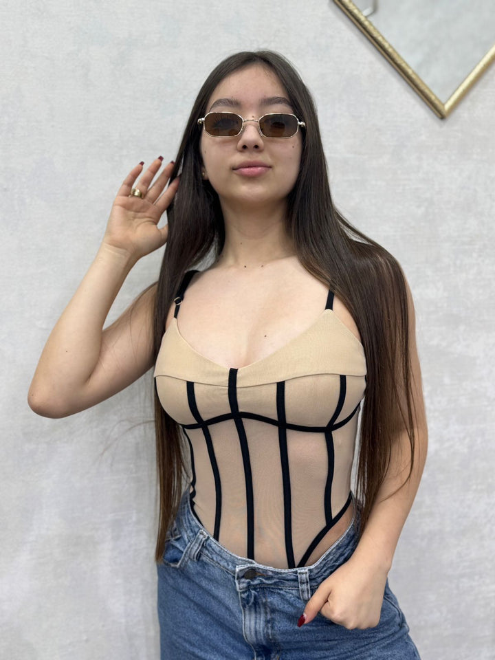 Diseño: Presenta un diseño audaz con paneles de malla transparente y tiras tipo corset en contraste del color base que esculpen la figura. Su escote corazón realza el busto con tirantes delgados.
