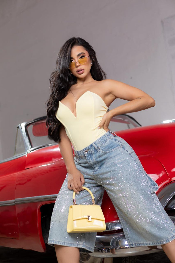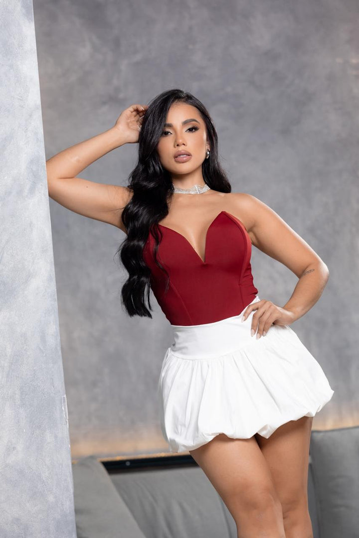 resenta un diseño minimalista y estratégico: un profundo escote en V strapless que realza el busto, combinado con un corte alto en la pierna que alarga visualmente la silueta. Su confección estructurada ofrece soporte y moldea la figura.