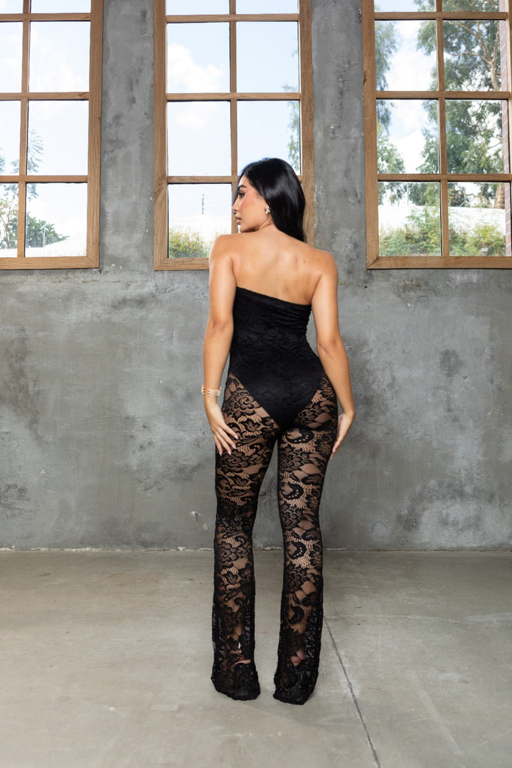Encaje, estructura y poder. este enterizo strapless en encaje negro floral es esa pieza que transforma cualquier noche. ideal para cenas con amigas, un rooftop al atardecer y noches de playa con estilo.