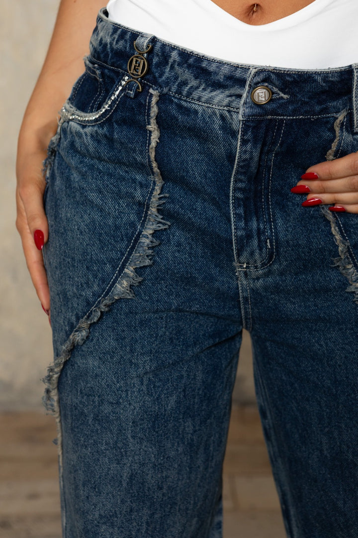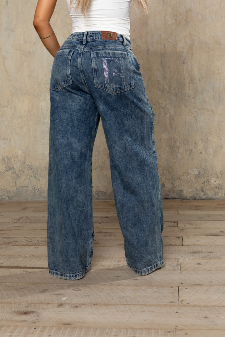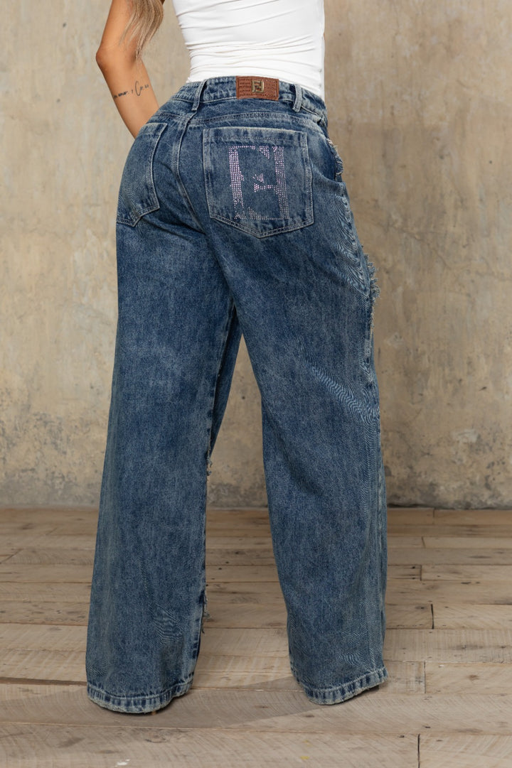 Un wide leg denim en tono azul profundo, con un efecto desgastado de alto impacto visual y cortes decorativos con terminación deshilada que crean líneas curvas y marcan todo el costado, aportando estructura y estilo
