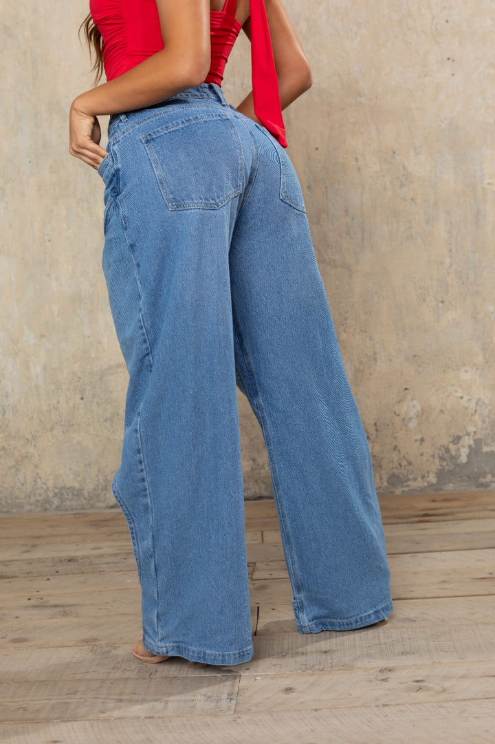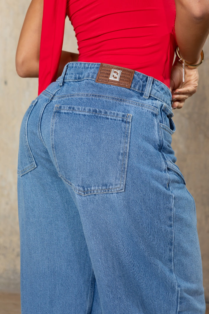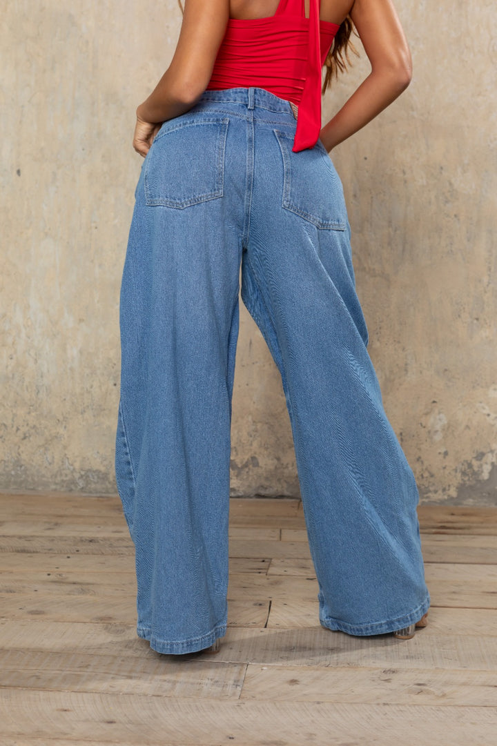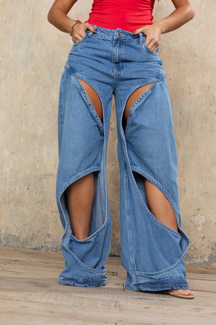Un jean wide leg de corte ultra contemporáneo, confeccionado en denim azul medio con aberturas arquitectónicas que enmarcan las piernas con un efecto curvo y fluido. Su diseño tridimensional y caído libre redefine el concepto del denim moderno: atrevido, sensual y de alto impacto visual.
