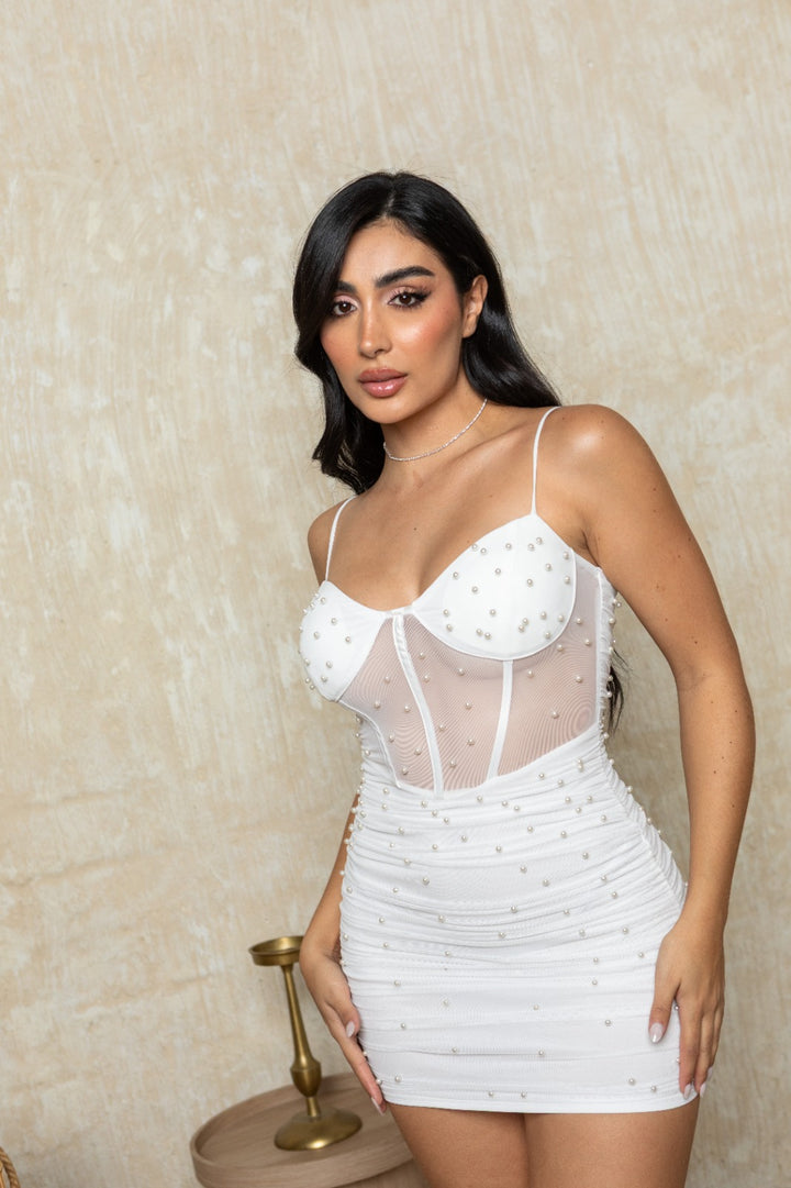 Delicado, sensual y con poder propio. Este vestido blanco con perlas tiene el toque justo de glamour para una noche especial, una cena elegante o una celebración inolvidable. Su estructura realza tu figura y el detalle perlado eleva el look con delicadeza.